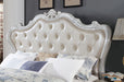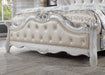 Right at first glance, the opulence of this set is undeniable. Both headboard and footboard are imposing in size with their centerpieces made of padded button-tufted flannelette, framed perfectly by intricate faux wood carvings straight out of the baroque era. The matching case goods share the same over-the-top details and lustrous, pearl white finish.