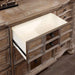 TIMANDRA Dresser, 66"W X 18 1/2"D X 38"H, 195.8lbs. There's something magnificent about home decor with transitional styling; this dresser is a perfect example. The floral and rope faux wood details are borrowed elements from traditional pieces, while the rustic natural tone finish brings warmth to any room. Bring in cold, modern elements such as reflective mirror panels for an updated look. Either way you look at it, this piece is bound to be an instant classic.