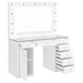 | Boasting a Hollywood regency flair, this vanity offers a bold, clean-lined aesthetic for a contemporary home as it shows off a white finish throughout that opens itself up to your existing color palette. Keep all of your cosmetics and beauty products organized within the seven spacious drawers, displaying special items in the top three. Above the top row of drawers is a clear tempered glass top that showcases everything beneath. Each drawer is also adorned with a glimmering crystal-like acrylic knob. Lastly, the oversized vanity mirror offers all the glow you need, complete with eleven globe-style bulbs that lend a vintage vibe. |