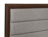 Create a chic, inviting retreat from the world with this modern wooden bedroom set. In a rich walnut wood finish, it imparts sophistication with a padded, upholstered headboard on the bed and drawers that are dotted with gold finish round knobs. The bed is complete with plush foam cushioning and taupe fabric, and features a tall headboard paired with a low footboard for an open look in your bedroom. Storage pieces add an austere, refined look with mitered trim work and tapering legs that add angularity. The set is crafted with durable engineered wood and features laminate surface that resist dents and scratches from everyday use to maintain a fresh, beautiful look.