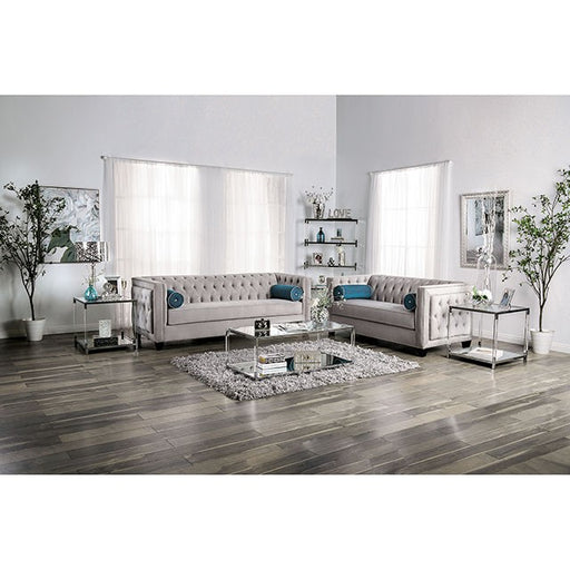 Featuring button tufted cushions with nail head trim borders, this fabric sofa set offers a timeless design bound to fit any living room.